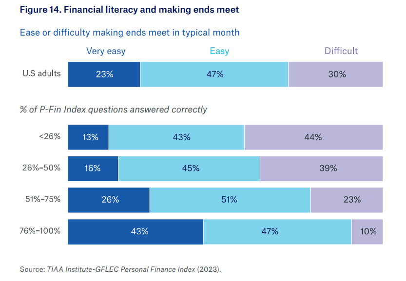 - U.S. adults with greater financial literacy have better economic well-being [7]. Nine years of data from the TIAA Institute–GFLEC P-Fin Index confirm that adults with higher financial literacy are better prepared for retirement and more financially resilient. Those with very low literacy are three times more likely to be financially fragile [7].