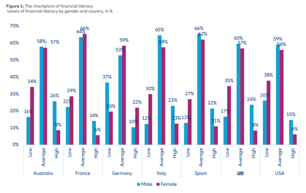 - There is a persistent gender gap, with women scoring lower on financial literacy globally [4]. Men are slightly more financially literate (35%) than women (30%) globally, according to the S&P survey. In the US, men correctly answer about 56% of P-Fin Index questions compared to around 46% for women — a gap that is roughly double the global average [5]. Germany is notable for being the one major country where women outperform men in the high financial literacy category [4].