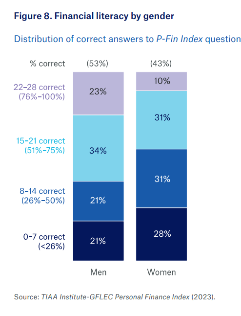 - The financial literacy of American women frequently lags behind that of men [5]. The 2025 P-Fin Index shows a roughly 10-percentage-point gender gap in correct answers. Women are also more likely to select “I don’t know” when answering questions (25% vs. 20% for men), even when controlling for actual knowledge levels. This gap is present across all functional areas, including borrowing, saving, investing, insuring, and comprehending risk [5].