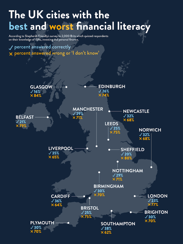 - Older respondents perform the best on financial literacy tests [23]. Those aged 55 and above perform better than any other age group, while those aged 18–24 perform worst. Both generations still score poorly in absolute terms, with only 34% of those 55+ and just 8% of those aged 18–24 passing the most recent Shepherds Friendly test.